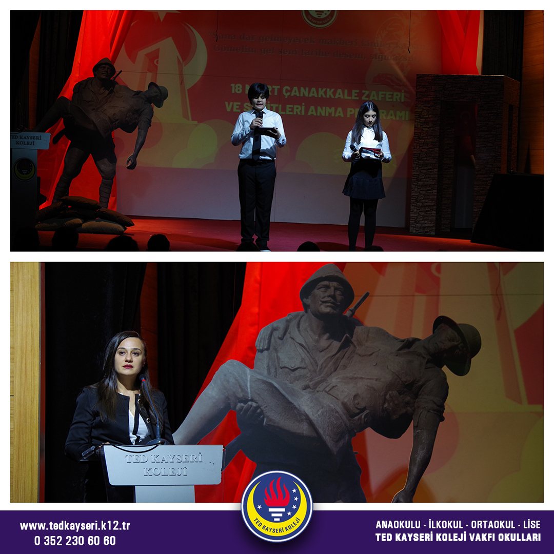 Çanakkale’yi bir zafere götüren ve Cumhuriyeti ilan eden birliktelik, dayanışma ruhu, mücadele bu yüce milletin eseridir. Cumhuriyetimizin Kurucusu Büyük Önder Gazi Mustafa Kemal Atatürk’ün “Çanakkale Zaferi, Türk askerinin ruh kudretini gösteren şayanı hayret ve tebrik bir misaldir. Emin olmalısınız ki, Çanakkale Muharebeleri’ni kazandıran bu yüksek ruhtur.” sözleriyle önemini vurguladığı Çanakkale Zaferi'nin 108. yıl dönümü kapsamında hazırladığımız program okulumuz konferans salonunda okul yöneticileri, öğrenci, öğretmen ve velilerimizin katılımı ile gerçekleştirildi. Çanakkale Zaferi’ni elde ettiğimiz o günlerde milletimizin gösterdiği kahramanlık, cesaret, dayanışma, birlik, fedakârlık ve mücadelenin o gün olduğu gibi tüm zorlu günlerde ortaya çıktığını gördüğümüz bugünlerde de tarihimize altın harflerle yazdığımız ve vatan toprağını korumak için yüz binlerce vatan evladını şehit verdiğimiz Çanakkale Destanı’nın 108. yıl dönümünü kutlarken Ulu Önder Mustafa Kemal Atatürk ve şehitlerimizi saygı, sevgi ve rahmetle anıyoruz.