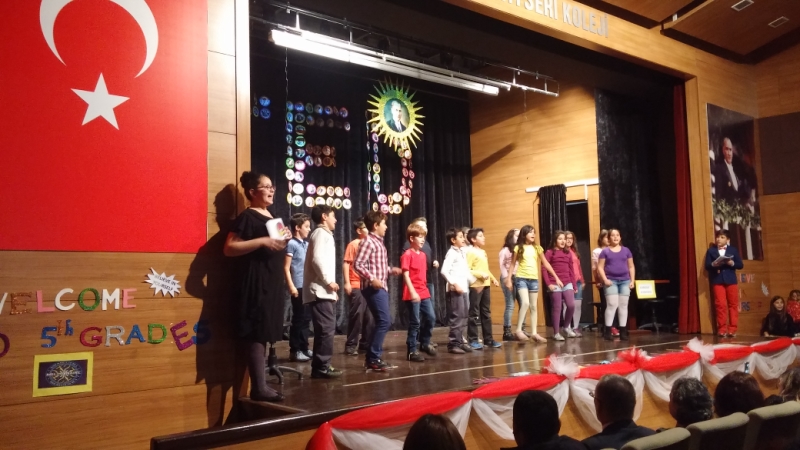5.sınıf öğrencilerimiz Dil Günleri kapsamında ilk etkinliklerini sergilediler. Etkinlik kapsamında kendine inanma ve güvenme temasını içeren aktiviteler yer aldı.” Believe in Yourself “adlı Ziggy Marley’nin şarkısını tüm salon birlikte büyük bir coşkuyla söyledi. “Who wants to be a millionnaire?” adlı bilgi yarışmasında “Crazy Professors”’ lar ,”Curious Scientists” ‘leri test etti. Mini skeçle ünlü futbolcular Neymar, Ronaldo, Gareth Bale , Messi’yi konuk ettiler. Shakira’nın “La La La” adlı şarkısında futbolcular ve dans grubu öğrencileri performanslarını sergilediler. Almanca “ Tanze wie du bist” adlı şarkıyı coşkuyla söylediler. Böylelikle İngilizce hazırlık sınıfımızın ilk gösterisi çok büyük beğeni kazanarak hem öğrencilerimiz hem velilerimiz için unutulmaz bir güzel anı olmuştur. Gösteride emeği geçen öğrencililerimize, bizlere eşlik eden velilerimize ve İngilizce öğretmenlerimiz Fatma BAYSAL, Tülin GÜRBÜZ ÖZKAN, İlmiye KARAKİMSELİ ve Almanca öğretmenimiz Çiğdem ERDEM’İ kutluyoruz.