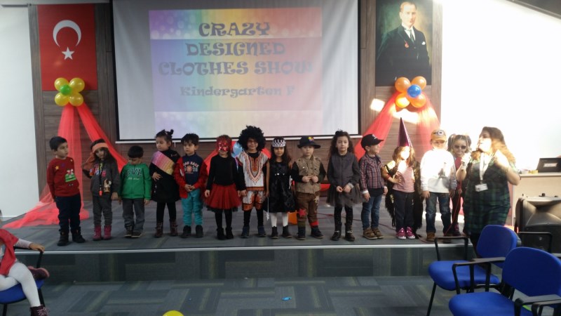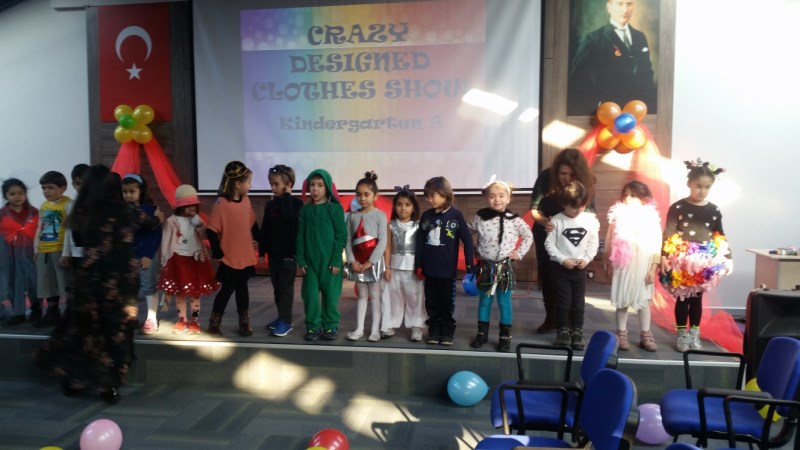 Okul Öncesi öğrencilerimiz, velileriyle birlikte tasarladıkları birbirinden çılgın giysileri sergiledikleri defilede hem çok eğlendiler hem de öğrendikleri İngilizce yapıları kullanma imkanı buldular.