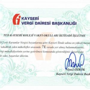 2012 yılı Kurumlar Vergisi beyanlarına göre Kayseri ilinde en yüksek kurumlar vergisi tahakkuk eden mükellefler arasında TED Kayseri Koleji Vakfı Okulları İktisadi İşletmesi 71. Sırada yer almıştır.